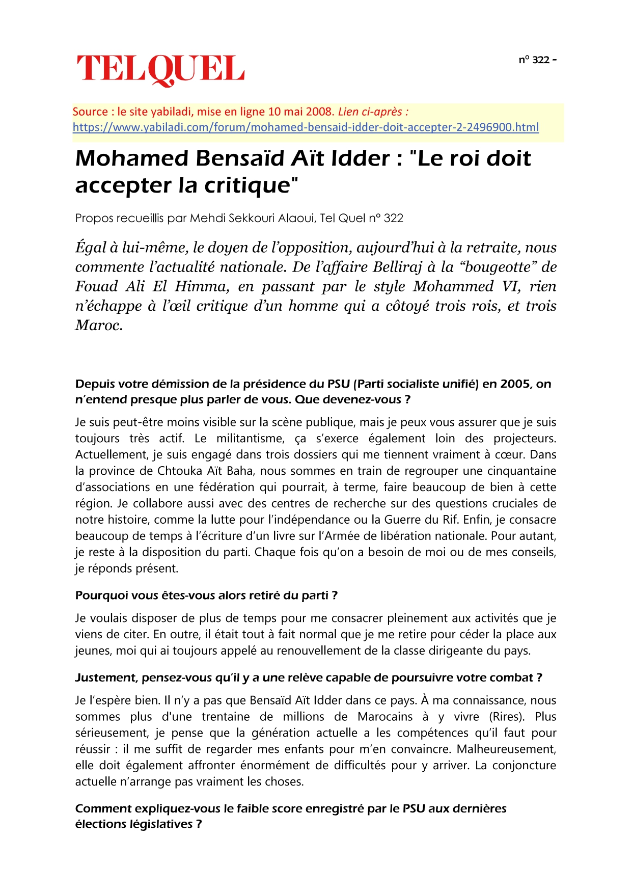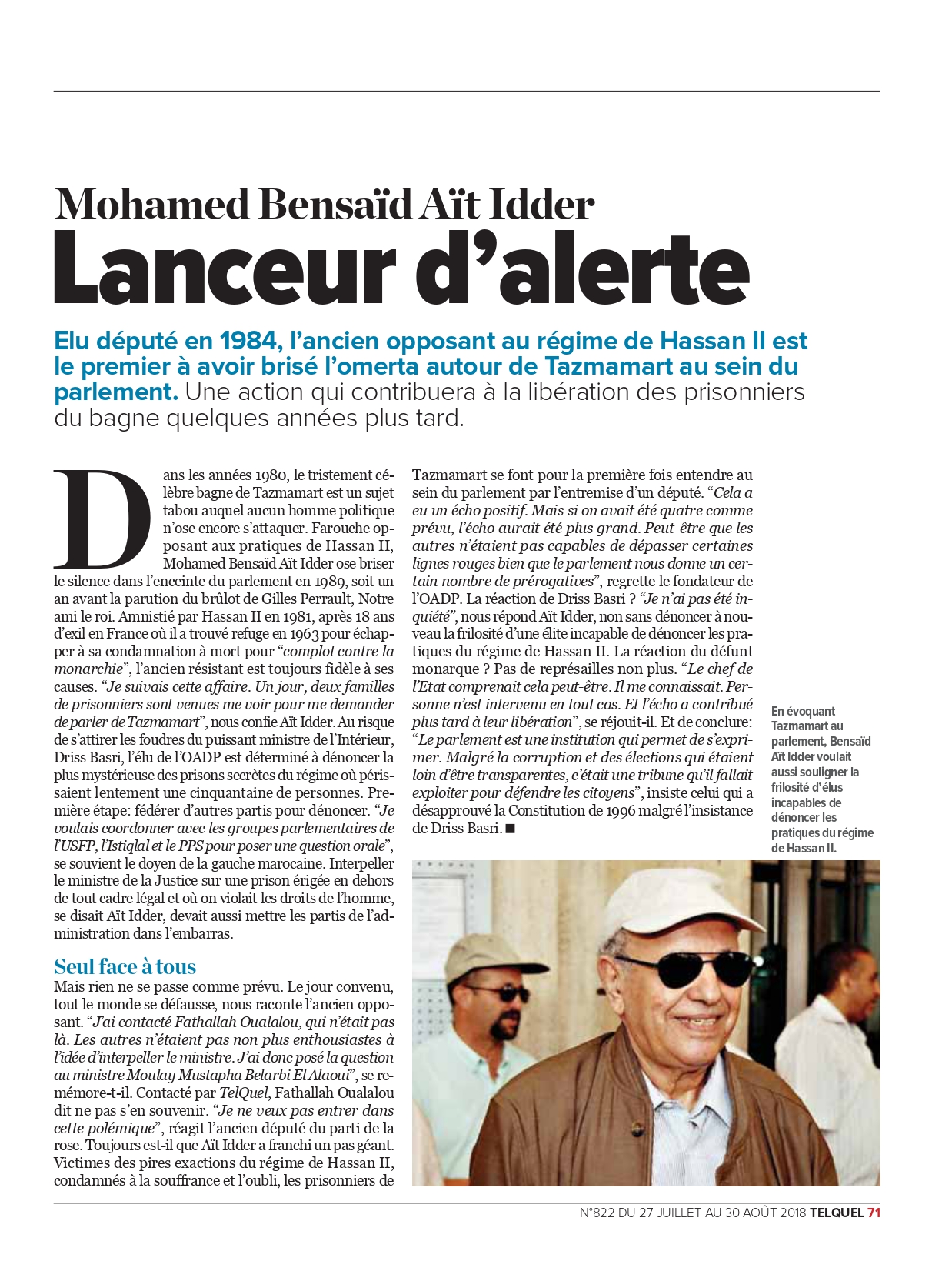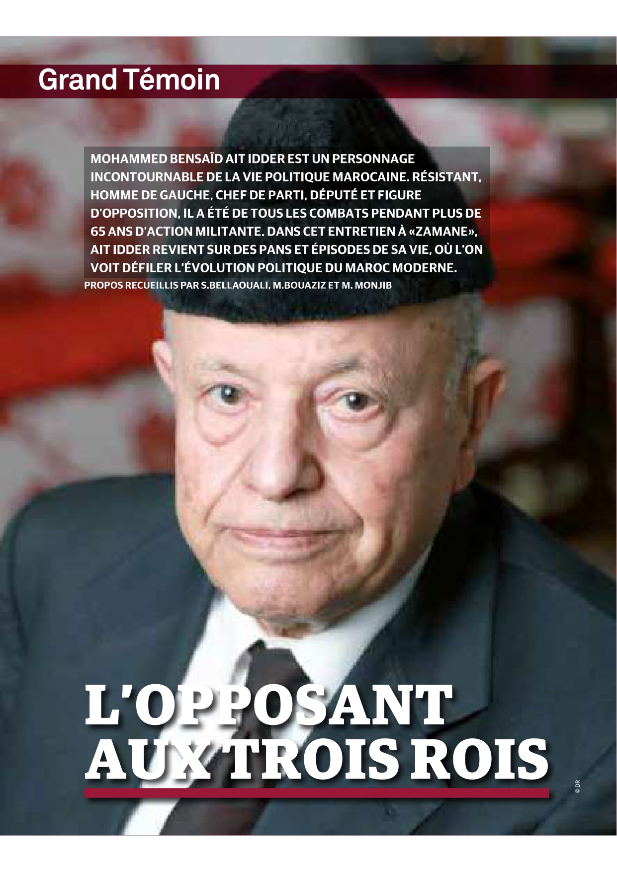 Il est à la fois difficile et aisé de présenter une personnalité de la dimension de Si Mohamed Bensaid, grand militant pour un Maroc libre et en phase avec l’histoire , pour des marocains libérés de la servitude et du sous-développement ou des ignorances et de toute entrave à leur droit de façonner leur propre histoire. Mohamed Bensaïd Ait Idder a été le contemporain de trois rois du Maroc. Avec Mohamed V, il a mené le combat de l’indépendance, comme résistant, puis comme responsable de l’Armée de libération marocaine du sud du pays. Sous le règne de Hassan II, il a été d’abord opposant et exilé durant 18 ans, dont 14 à Paris pendant "les années de plomb". Ensuite comme parlementaire et figure de la Koutla démocratique. Il a essayé avec ses partenaires de réformer le système politique de Hassan II, de l’humaniser et de le démocratiser. Avec l’avènement du roi Mohamed VI, Bensaid a nourri le rêve d’un sursaut national engageant le Maroc dans un processus d’insertion positive dans le nouveau monde en gestation. Ce grand résistant, affable, ouvert, modeste avec les autres et rigoureux avec lui-même, autocritique, mais également confiant et ouvert sur l’avenir.