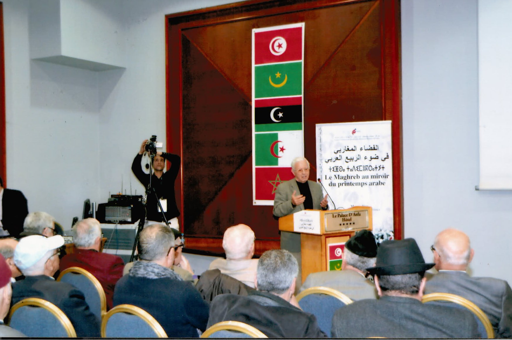 Le CERM, moins d’un an après sa fondation, célébrait, en février 2012, le premier anniversaire du Printemps arabe, par l’organisation d’une grande Mounadara : L’Espace Maghrébin au miroir du printemps arabe. Cette Mounadara se voulait une rencontre entre deux générations des pays du Maghreb : celle des hommes et des femmes qui ont pris les armes pour l’indépendance et celle des jeunes qui ont arpenté les rues et porté haut et fort leur soif de dignité et de démocratie. Sur trois jours, plus de 200 participants venant d’horizons divers : hommes politiques de diverses sensibilités, chercheurs dans différents domaines, acteurs associatifs, chefs d’entreprises…ont croisé les regards qu’ils portaient sur le Maghreb et son devenir. Mohamed Bensaid Ait Idder était le symbole et le catalyseur de ces retrouvailles maghrébines. La mounadara lui a rendu un vibrant et immense hommage.